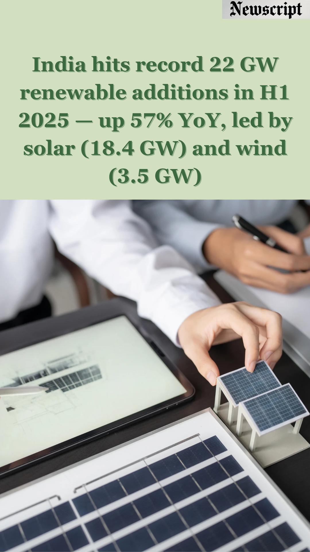 India added a record 22 GW of renewable energy capacity in H1 2025, marking a 57% increase year-on-year. Solar dominated with 18.4 GW, followed by 3.5 GW of wind, underscoring India’s accelerating transition away from fossil fuels.